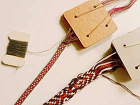 あらかじめバンド織り用に柄や糸がセットされたカードを使って織る、