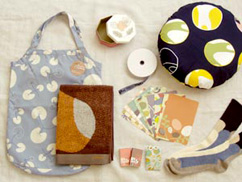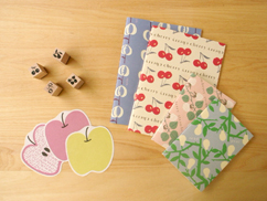 フルーツ柄のノートやカード、スタンプとバラ柄のテキスタイルを使ったトートバックやポーチの取り扱いを通信販売にて始めました。こちらはステーショナリーメーカー、マークスとのコラボレーションアイテムです。