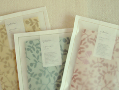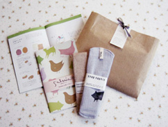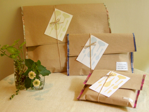 お誕生日、結婚、出産、転居などちょっとしたお祝いにおすすめなサルビアのギフトセットができました。パッケージは厚手のクラフト紙とはぎれを縫い合わせた封筒型。通信販売限定のオリジナルメッセージカードが付いています。
