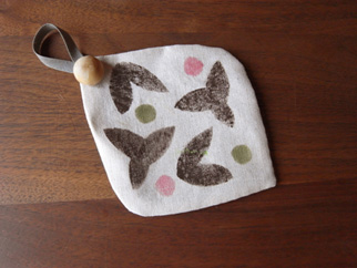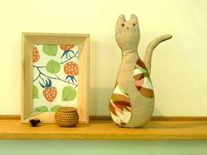ネコ、うぐいす、ゾウの3種類。ポイントに使っているテキスタイルはRe;foRmで作った竹久夢二のバラ柄です。裏面がパイル地になっていて手触りが気持ちいいです。小さなお子様への贈りものなどにいかがですか?