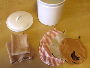 ![]() 布ナプキンをつかってみよう ![]() オーガニックコットンと廃材生地でできている salvia×touta.の布ナプキン。 かわいいから、コースターなんかにしてもいいし、 ふつうに手を拭くのにつかってもいい。 肌触りのいい布だからどんな用途にも使えます。 その中でも、布の気持ちよさを実感できておすすめなのが、 生理用ナプキンとして使うこと。 でも、実際どうやってつかえばいいのかな…? 今日は、気になるみんなの使い方をスタッフよりレポートします! ![]() お話を伺ったのは、イラストレータの小川かなこさん。 季刊サルビア12号でも素敵なイラストを描いてくださっています。 ![]() ![]() 「前から知ってはいたけれど、どこで買えるのかわからなくて」 と、12号の取材先touta.さんで小川さんは布ナプキンに興味津々。 salvia×touta.の布ナプキンが出来上がったのをきっかけに、 布ナプキンを愛用しているとのこと! ![]() 今日は、いろんな種類とサイズを持ってきました。 「スナップナプキン、たくさん色柄があるのが楽しくていいですよね〜。 あ!この白い四角い形のは使ったことないです。」 これはワッフル素材のナプキンで、さらっとして気持ちがいいです。 通気性がいいから、特に蒸し暑い夏におすすめ! 小川さん愛用のセットをみせてもらってもいいですか? ![]() 「スナップナプキンとパイル素材のナプキンをつかっています。 ホーローはつけ置き洗い用に。蓋付きだから家族にもばれないし安心。」 乾いたナプキンは一晩水につけて置くと ずいぶんと汚れの落ち具合が違います。 ところで小川さんは、どんな使い方をするんですか? ![]() 「私は生理の前後が長いので、 スナップナプキンのXSサイズをよく使います。 すぐ乾くから、夜に洗って干しておいて また翌朝使う。かなりヘビーローテーションです(笑)。」 なるほど…! XSは、薄くてサラっとした使い心地が評判です。 量が多いときはどうしてますか? 「パイルとスナップを重ねて使ったりもしますけど… 夜とか、本当に多いときは市販のナプキンと併用してます。」 あ!わたしも併用派です。 お洗濯が間に合わなかった時とか、よくそうしています。 ![]() ここで、サルビアスタッフ篠田もお話に加わり…… 篠田:「わたしは夜や、多いときに使う派なんです スナップのMサイズとワッフルパイルを重ねて使っています。」 ワッフルパイルとは…こちら! 片面ワッフル、片面パイルのすぐれものなナプキンです。 ![]() 篠田:「ワッフルパイルを三つ折りにして… スナップの上に乗せて使います。 この、パイルの肌触りがきもちいいのですよね〜。」 ![]() あ!スナップの上に乗せる派なのですね。 ずれてきたりはしませんか? 篠田:「固定をしていないので多少は… でも布同士なので、そんなにずれることはないし、 ちょっとずれても、スナップナプキンを ショーツに固定しているから安心です。 とにかく、このパイルの心地よさが好きなので…」 小川:「へ〜。多いときもか…試してみたいですね。」 篠田:「ワッフルパイルはちょっと厚手なので 洋服によっては気になるかもしれないですが、 寝るときとか、ゆったりした服装のときに使えば大丈夫です。」 私からも、夜にこそ布ナプキンをおすすめします! 寝返りうったりするし夜に布ナプキンは心配、 という人もいますが、 使い捨てナプキンの方が伝い漏れが多いんです。 布だとちゃんと吸収してくれるので、安心なんですよ。 ![]() 篠田:「あと、畳んで小さくなるのも布のいいところ。 外出中でも使ったら丸めてポーチへ。」 小川:「そうそう! ジップロックとかに入れておけば臭いも気にならないし」 布の扱い方は、ひとそれぞれで面白いですね! ナプキンのサイズもいろいろありますから、 自分に合った使い方ができるのもいいところです。 ところで、小川さん。 季刊サルビアにも使用例やみんなの意見を載せていますが 参考になったページ、ありますか? ![]() 小川:「やっぱり、この使い方のページは参考になったけど… ![]() 小川:こっちの『touta.のナプキンのこだわり』のページをよく読みました。 なんで『布』がいいのか、が分かりますよね。」 そうなんです。touta.さんのナプキンが どうして廃材生地を使うのか、どうしてオーガニックコットンを使うのか… いろいろ考えさせられるページです。 ![]() ではでは、みなさんも布ナプキンをぜひ一度おためしあれ! 小川かなこさん、どうもありがとうございました! サルビアの布ナプキン一覧ページはこちら 小川かなこさんのHPはこちら |